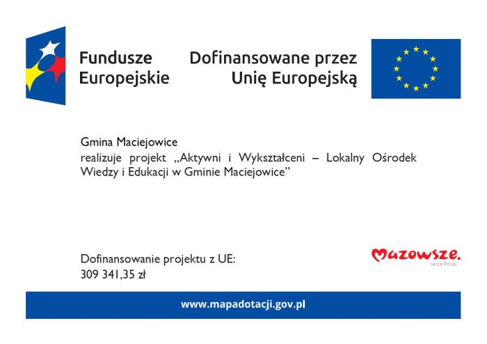 Gmina Maciejowice realizuje Projekt „Aktywni i Wykształceni – Lokalny Ośrodek Wiedzy i Edukacji w Gminie Maciejowice”, współfinansowany z Europejskiego Funduszu Społecznego Plus w ramach Priorytetu Fundusze Europejskie dla nowoczesnej i dostępnej edukacji na Mazowszu Działanie Edukacja osób dorosłych poza PSF programu Fundusze Europejskie dla Mazowsza 2021-2027.
