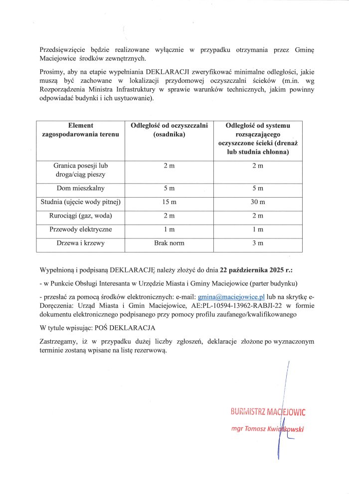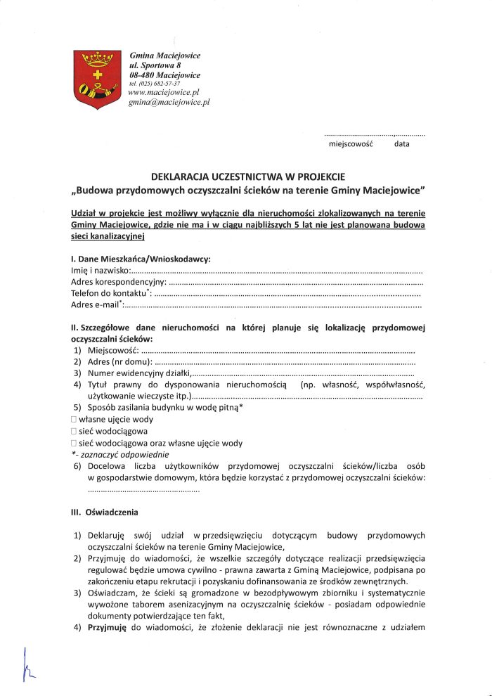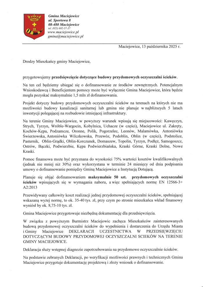 Gmina Maciejowice zaprasza Mieszkańców zainteresowanych przydomową oczyszczalnią ścieków do złożenia deklaracji