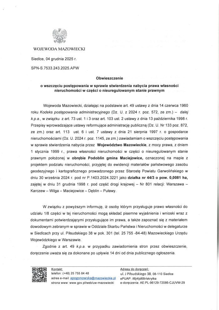 Obwieszczenie o wszczęciu postępowania w sprawie stwierdzenia nabycia prawa własności nieruchomości w części o nieuregulowanym stanie prawnym