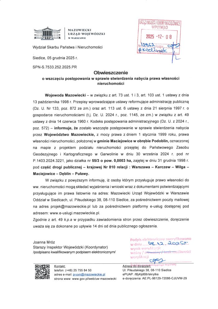 Obwieszczenie Wojewody Mazowieckiego o wszczęciu postępowania w sprawie stwierdzenia nabycia prawa własności nieruchomości