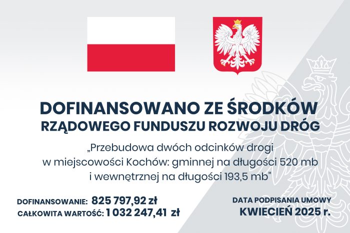 Zadanie „Przebudowa dwóch odcinków drogi w miejscowości Kochów: gminnej na długości 520 mb i wewnętrznej na długości 193,5 mb”
